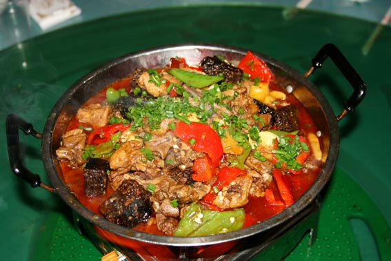 【 鳳凰血粑鴨子 】 血粑鴨子是鳳凰最具特色的地方菜之一,制作時(shí)將預(yù)先浸泡好的上等糯米裝入碗里,宰殺鴨子時(shí)將鴨血溶入糯米浸泡均勻。等鴨血凝固了,再蒸熟,放冷后,將血粑切成一小塊小塊的方塊,然后用菜油煎熟。待鴨肉煮九分熟時(shí),再將血粑放入鴨肉里烹煮,并摻合一定的香料物品,成金黃色即可,鴨子煮血粑既有鴨肉的鮮美味濃,又有血粑的清香糯柔,吃起來(lái)口感香濃,食欲大增,真是稀有的人間美味佳肴。