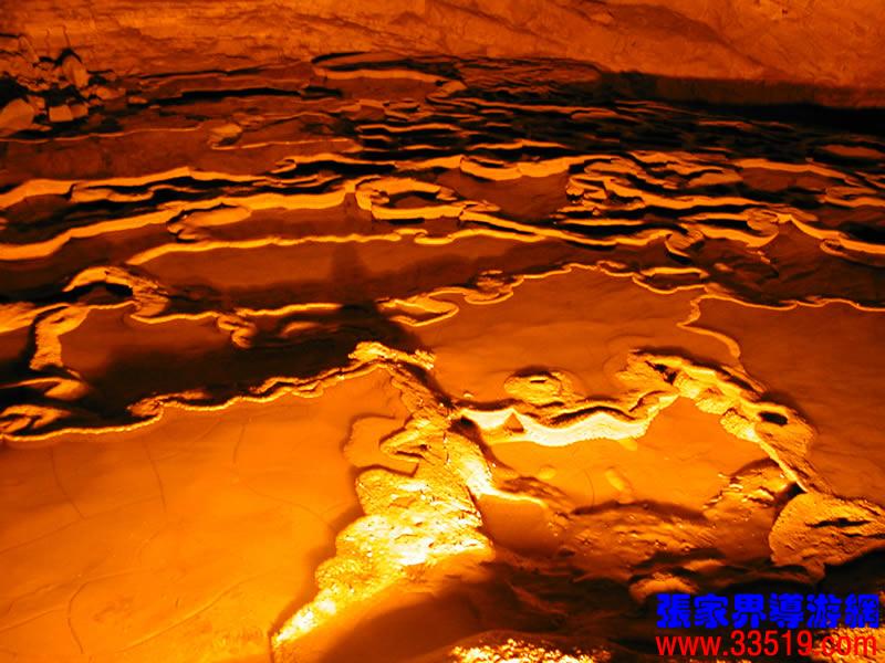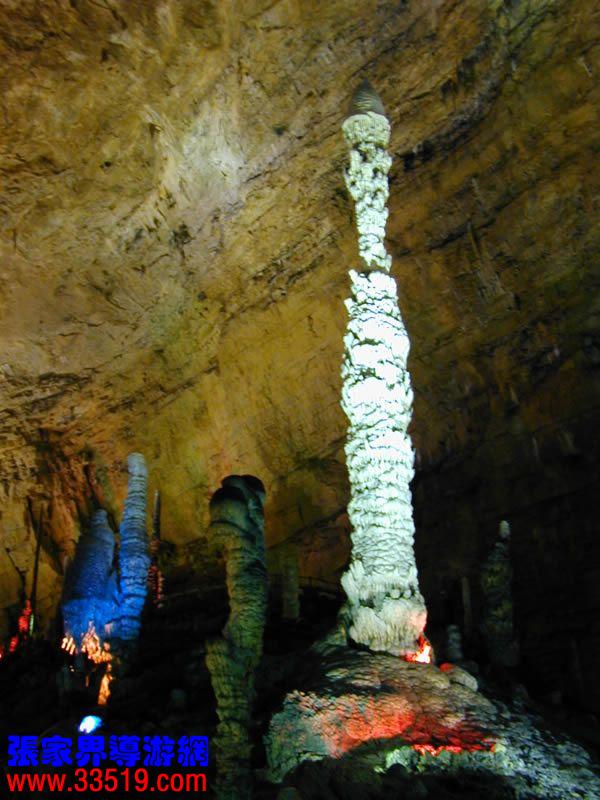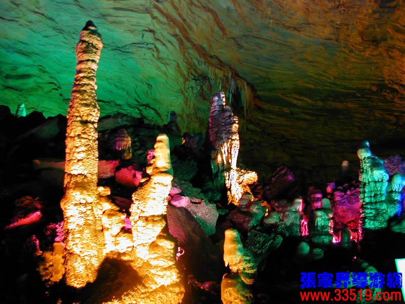 (龍宮)龍宮是黃龍洞十三個(gè)大廳中最大的一個(gè),也是景色最美的景點(diǎn)之一,底面積15000平方米,平均高40米,兩千余根石筍拔地而起,千姿百態(tài),異彩紛呈,或如飛禽走獸,或如宮廷珍藏,有的像巍巍雪松,有的像火箭升空。龍宮后園有金銀兩座花池,清水常溢,花簇盛開(kāi)。宮頂鐘乳柳垂簾掛,四周壁畫(huà)栩栩如生。溶解著各色各樣的礦物質(zhì)的水,從巖層中滲透出來(lái),滴落下來(lái)。礦物質(zhì)在洞頂凝固結(jié)晶成倒懸鐘乳石,從鐘乳石滴落的水又把礦物質(zhì)澆疊、堆壘在洞底,而長(zhǎng)成節(jié)節(jié)向上的石筍。大家看看這龍宮的造型,領(lǐng)略這磅礴的氣勢(shì)。洞內(nèi)最大石筍,高12米、直徑10米的漢白玉天然石椅“龍王寶座”居高臨下,眾多石柱石筍似人似物,維妙維肖,圍著寶座朝拜山呼,幾十座珊瑚亭亭玉立,儼然一支龐大的“宮廷樂(lè)隊(duì)”。湖南著名教授羊春秋先生作《寄生草》詞對(duì)此進(jìn)行描繪:“百態(tài)千姿模樣,三宮六院門(mén)巷。龍王開(kāi)宴設(shè)瓊漿,猴王偷果鬧天堂,君王納寵擁羅帳。搬演了人間爭(zhēng)攘,匯集了天下奇觀。”
