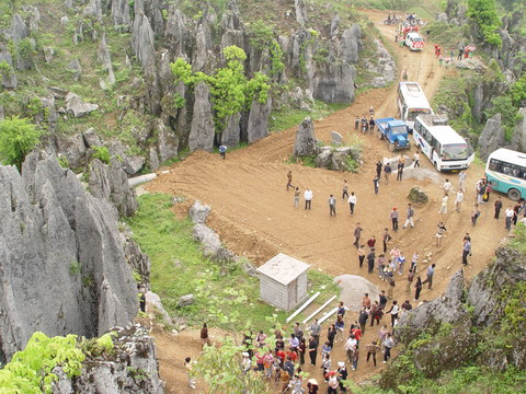 登上洛塔,只見連山綿谷,萬石如林,一塊塊青灰色的大石頭競高競秀,競美競奇,綿亙縱橫,層疊交錯,造型奇特,塔狀、蓮臺狀、羅漢狀、錐狀、刀狀、箭簇狀、帷幕狀等林立薈萃,像一個個神奇的迷宮,組成洛塔地質(zhì)公園的旖旎景觀。有的玲瓏斫剔,若女繡工鐫;有的嶙峋怪異,如鬼斧神鑿;有的崢嶸巉峻,似水墨丹青;有的嵯峨兀立,藤蔓纏繞,更像一株株挺拔的古樹。高的、矮的、大的,細的。粗、瘦、皺、滑,各具特色,如人之面目相具而無一相似者,在綠樹紅花間亮麗起一道道迷人的風景。洛塔石林遍及整個山界,較集中的有楠竹車水坪石林、梭洛趙家灣石林、八仙洞石林及公路沿線的銀河塔石林,僅車水坪一帶的石林面積就達1000多畝。無論其規(guī)模面積,造型及組合情況,洛塔石林都可與云南石林媲美。