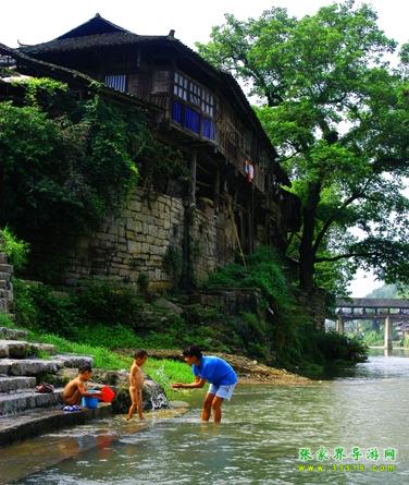 民宅多為吊腳木樓,依山傍水而建,臨河者倒影澄潭如水中街市,依山者雄峙高崖似空中樓閣。兩條河潔凈透亮,其中小河尤為美麗,青山夾岸,綠水長流,河畔蓼紅芷白,桂馥蘭芳,素有“香溪”之稱。其水盡來自溶洞,距街三里之內(nèi),就有魷魚洞、犀牛洞、王家洞、向家洞幾股洞泉和一個叫“雞屎潭”的溫泉。 “雞屎潭”來有濃重的硫磺味,水溫如沸,除污力極強(qiáng),根本不需肥皂便能將汗?jié)n洗得干干凈凈,并能醫(yī)治瘡疥,維護(hù)皮膚健康。河中多魷魚,肉嫩且肥,立冬前盡逆水潛入溶洞起冬,立夏前兩三天則成群結(jié)隊(duì)隨夏汛而出,鄉(xiāng)人在洞口安上網(wǎng)壕,只需“守株待兔”,便能得到豐盛的收獲。在20世紀(jì)70年代以前,有時(shí)每天可得幾百斤。 小河灘多流急,是漂流的極佳去處。