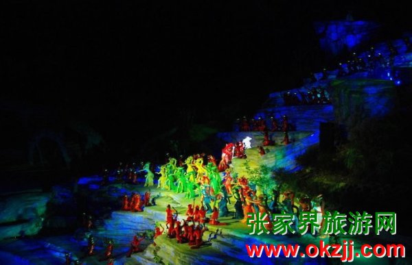 是目前世界第一臺(tái)有完整故事情節(jié)的山水實(shí)景音樂歌舞劇。舞臺(tái)選址在天門山風(fēng)景區(qū)山門口內(nèi)至天門山頂?shù)恼麠l峽谷,總投資達(dá)到1.2億元,演員隊(duì)伍達(dá)530多人。主舞臺(tái)以10000平米的玻璃鋼打造,是目前世界最大的全景玻璃鋼舞臺(tái)。