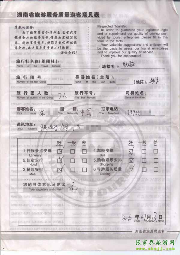 2010年7月13日陜西張先生一行7位旅游質量反饋
