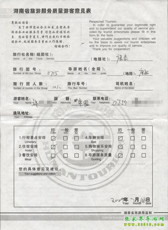 7月15日許先生一行10人張家界旅游質量反饋單