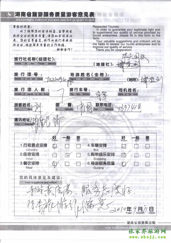 2010年9月10日劉先生對(duì)導(dǎo)游的素質(zhì)高,態(tài)度好,很滿意