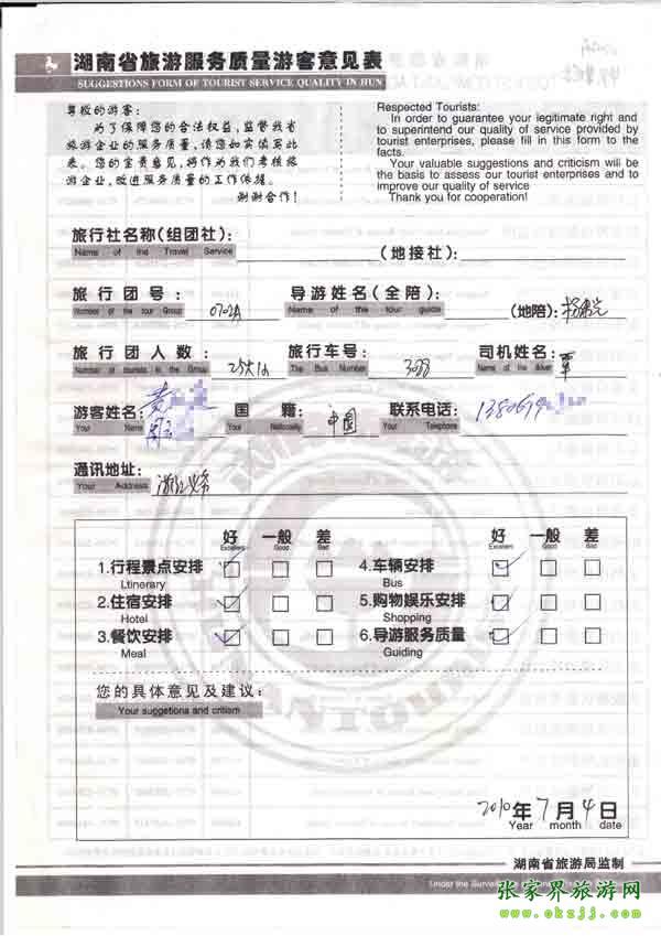 2010年7月4日浙江黃先生一行兩位旅游質量反饋