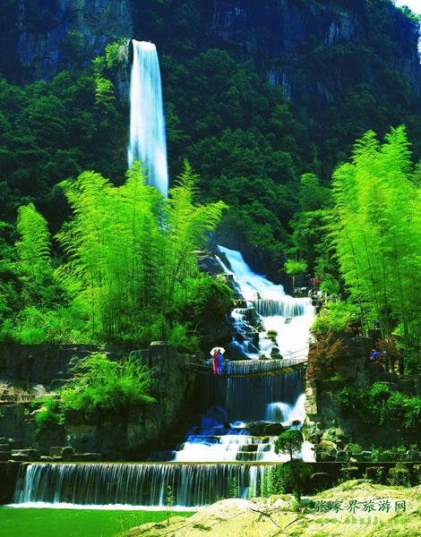 寶峰飛瀑 寶峰橋左前方山腰4O余米處,一水飛流而下。先直瀉,后順坡漫灑于鐵索橋處池中。兩水池相疊,波光盈盈,翠竹、紅樹(shù)、人影盡映其中,宛若畫(huà)盤(pán)。書(shū)法家沈鵬游覽寶峰湖后題—飛流界峰”四字,鐫刻于飛瀑石上方峭壁。