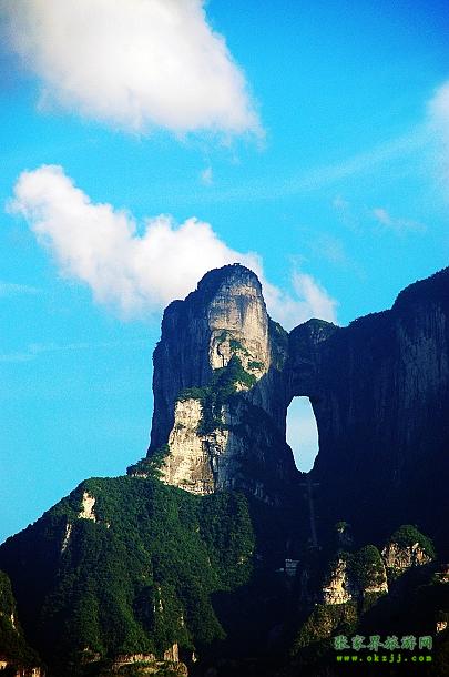 天門(mén)洞簡(jiǎn)介 天門(mén)洞是天門(mén)山最具有代表意義的景點(diǎn),它位于天門(mén)山山體的中上部,海拔1300米,門(mén)高131.5米,寬57米,深60米,是世界上最高海拔的天然穿山溶洞。 天門(mén)洞南北對(duì)開(kāi)于千尋素壁之上,扶搖而通天,氣象變化萬(wàn)千,似明鏡似天門(mén)鑲嵌于蔚蔚天幕之上,終年吞白云吐紫霧,渲染著神秘莫測(cè)的氣氛而更顯出塵脫俗,正所謂奪盡天地之造化,藏盡天地之玄機(jī),而成為千古難解之謎,尋尋覓覓,終是難解。置身其間,宛如入身天宮帝閣一般,大有“我欲乘云仙飛去,直入九霄攬乾坤”之感。“天門(mén)洞開(kāi)云氣通,江東峨眉皆下風(fēng)”元朝的著名詩(shī)人張兌曾這樣贊嘆,磅礴的氣勢(shì)由此可見(jiàn)。