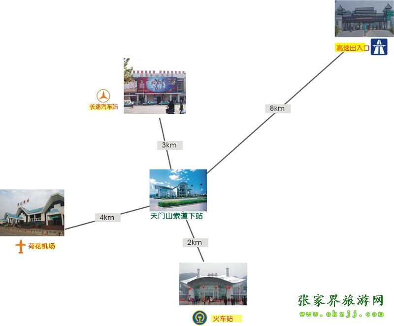 ![]() 天門(mén)山索道下站距荷花機(jī)場(chǎng)3公里,距火車(chē)站0.5公里,距長(zhǎng)張高速公路出口也僅8公里之遙。景區(qū)周?chē)碛袕埩_、張清、張桑等公路通往省內(nèi)各個(gè)方向。進(jìn)城公路和市內(nèi)主要道路均安裝了交通指引標(biāo)示,寬暢的道路和清晰的指引路牌使得游客抵達(dá)天門(mén)山特別方便順暢。